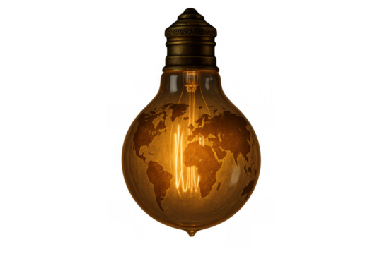 Light bulb with a world map design glowing, representing global ideas, innovation, and worldwide brilliant electrical energy