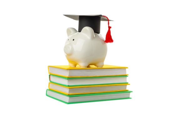 Piggy bank on books symbolizes education savings, isolated, PNG