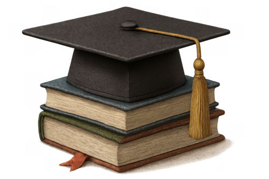 Graduation cap mortarboard with tassel on stack of educational university books, symbolizing academic achievement knowledge and learning