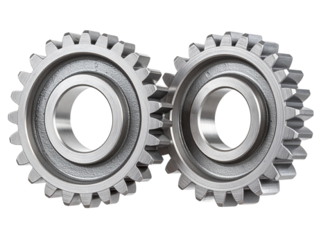 Brushed metal gears interlocking and rotating smoothly on a transparent background, symbolizing teamwork, engineering, and precision