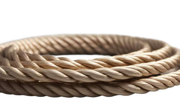 Thick natural fiber rope coil with a secured end isolated on transparent background