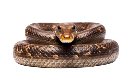 Detailed close-up of a coiled brown rattlesnake with black background, cut out