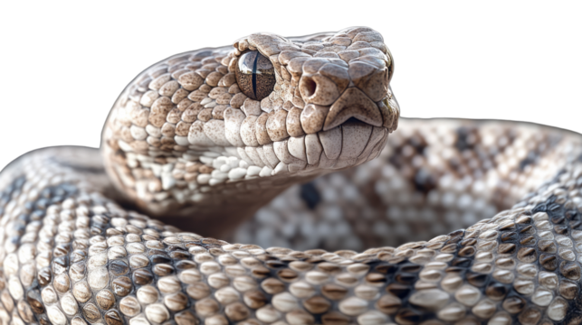 A close-up of a beige and brown coiled rattlesnake showcasing its distinct scales and head features. Isolated on transparent white background, png