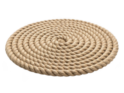 Thick natural fiber rope coiled into a flat circular mat shape isolated on a transparent background image