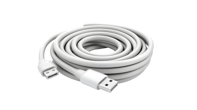 Black cable with chrome connector, with a protective cap, coiled against a black background