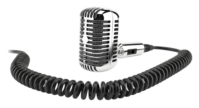 A vintage chrome microphone with a coiled black cable isolated on transparent background, perfect for recording studios, podcasts, and retro audio enthusiasts