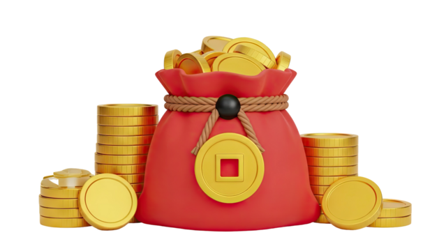 3D Red money bag overflowing with gold coins and stacks on transparent background