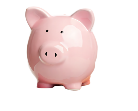 Hand inserting coin into pink piggy bank on transparent background