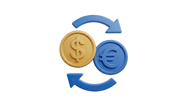 3D Dollar and Euro coins with exchange arrows on transparent background