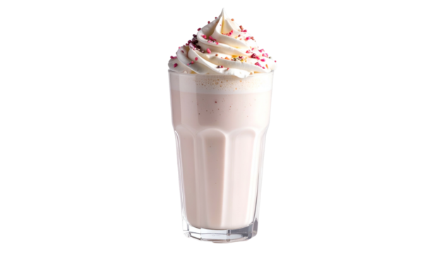 Pink milkshake with whipped cream and colorful sprinkles, isolated