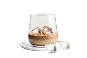Refreshing iced coffee drink with cream and ice cubes isolated on transparent background. Iced coffee latte in glass this refreshing iced isolated on white background.