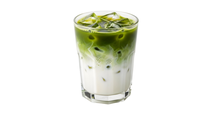Delicious matcha latte with artistic foam design, isolated on white background.