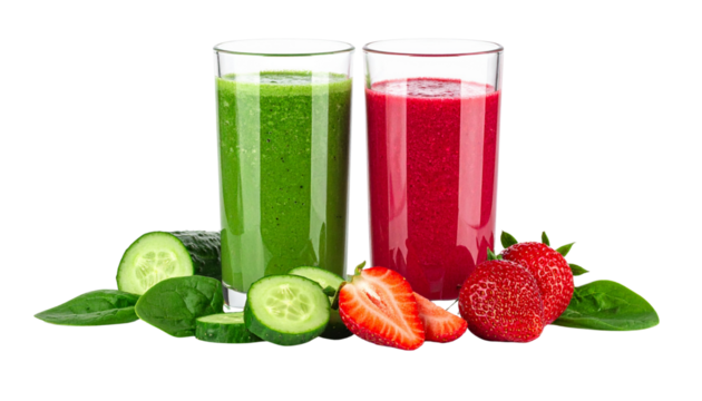 Two freshly pressed fruit and vegetable smoothies isolated on transparent background for health and wellness visuals