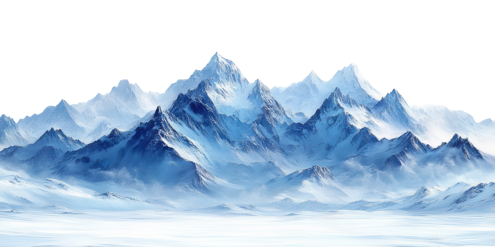 Snowy mountain peaks with misty valleys, winter landscape, majestic alpine scenery, frozen wilderness, cold weather, travel adventure, natural beauty, isolated on transparent background