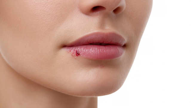 Herpes simplex virus type 1 is causing a painful cold sore on a woman's lip, isolated on a transparent background, ideal for health and medical related projects