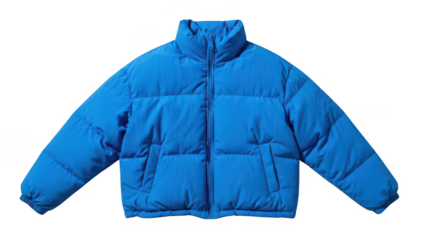 Blue puffer jacket isolated PNG on transparent background, stylish outerwear for cold weather and outdoor activities