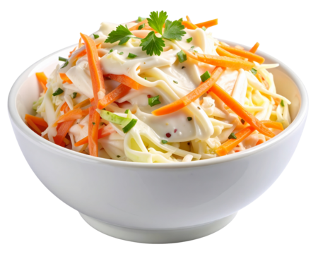 Classic coleslaw with shredded cabbage and creamy dressing in white bowl isolated on white or transparent, PNG