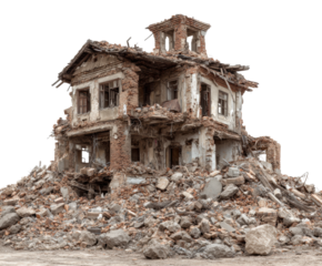 A partially collapsed brick building, with rubble at its base, showing visible interior walls and broken windows, symbolizing devastation. Isolated on a transparent background