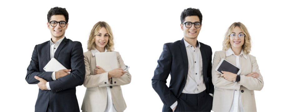 Diverse colleagues smiling with clipboard in hand on transparent background