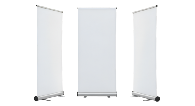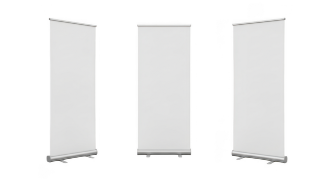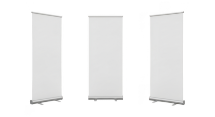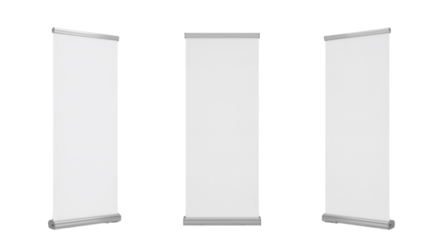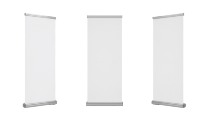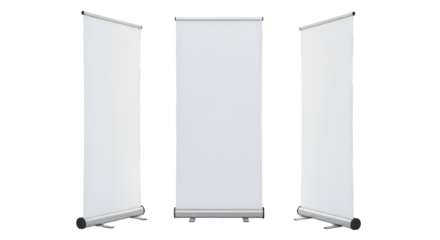 Set of three blank white roll up banner stand mockups from different angles. Isolated on transparent background, png