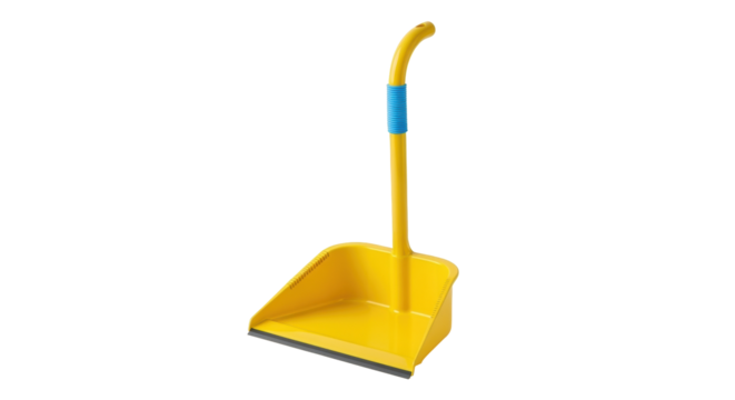 Robotic arm holding a blue plastic wheeled trash container on a transparent background