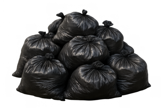 Pile of tied black plastic bags filled with household garbage and refuse, representing waste management, disposal, and environmental concerns