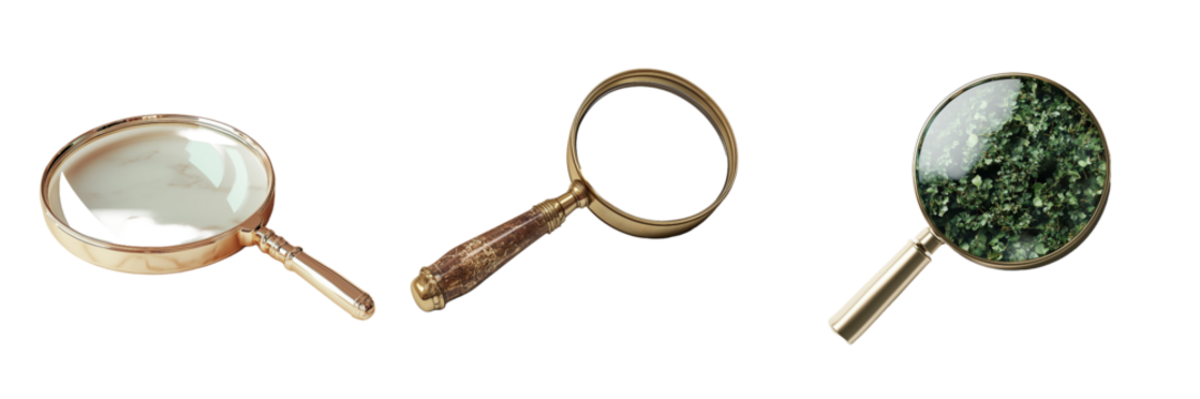 Magnifying glass collection displaying different angles and light reflections for close inspection