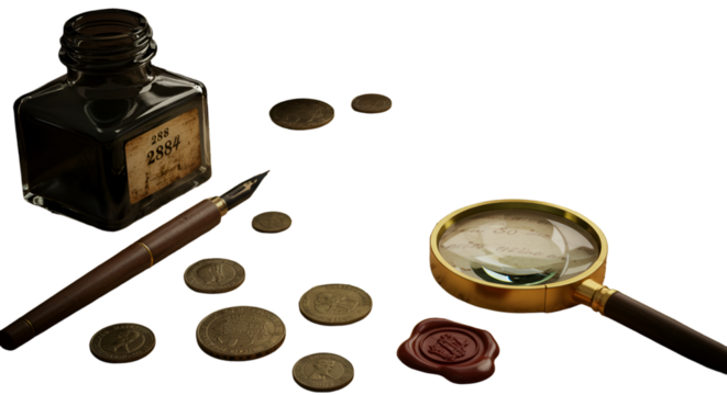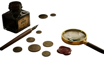Vintage Writing Tools and Coins with Magnifying Glass