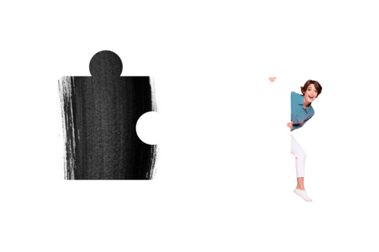 Trend artwork 3D image photo collage of huge dilemma solve jigsaw solution startup miniature young woman appear smile solve puzzle piece