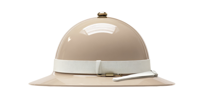 Beige safari helmet, profile view.  White band around crown.  Shiny surface.  A  classic,  protective headwear