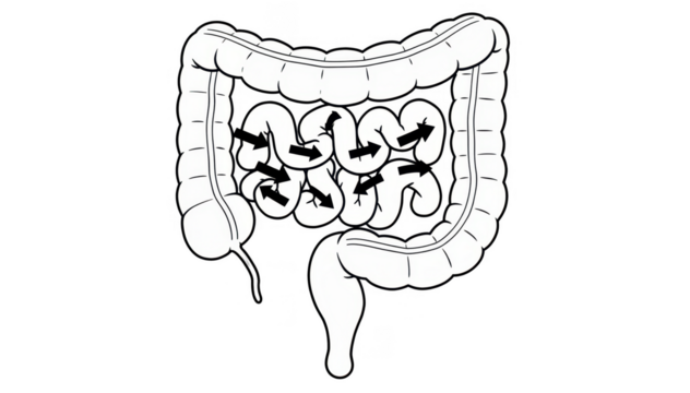 Monochrome line art of a human colon highlighting slowtransit constipation with arrows indicating delayed motility on a white background.