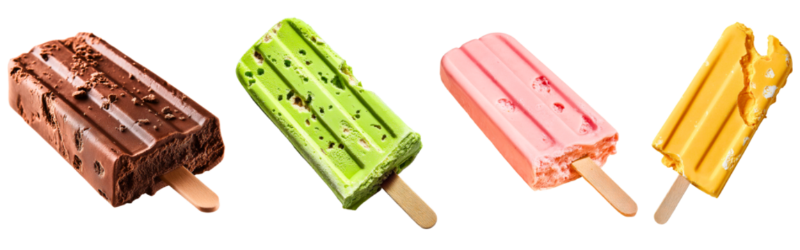 Collection of pastel ice cream bars including chocolate green pink and yellow isolated on a white or transparent background