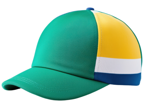 Colorful Cap with Green, Yellow, Blue, and White Panels on a Transparent Background for Fashion and Sports Themes
