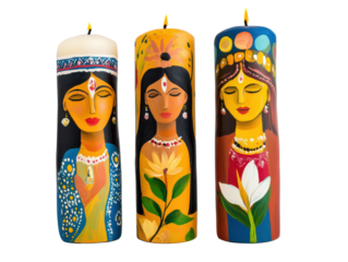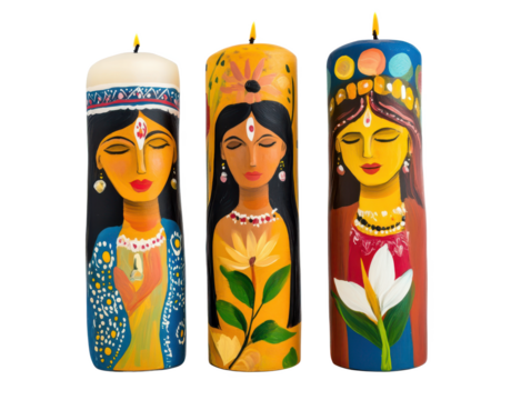 HandPainted Goddess Candles Vibrant Yellow, Blue, & Red Folk Art Decor