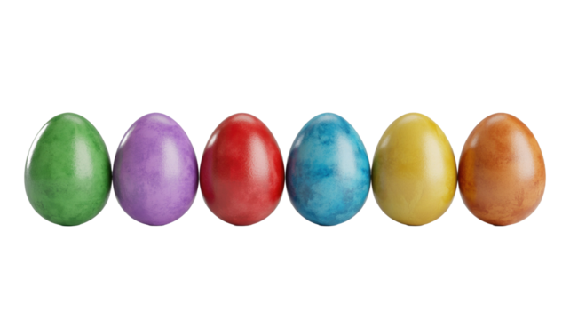A vibrant line-up of six colorful eggs, including green, purple, red, blue, yellow, and brown, perfectly arranged for Easter or spring themes. background removed