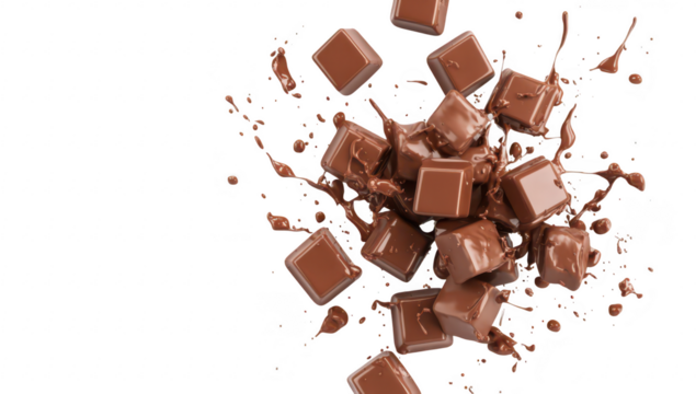 A dynamic splash of chocolate cubes scattered artistically against a white background. highlighting the rich texture and color of the chocolate. ideal for culinary or dessert-themed visuals
