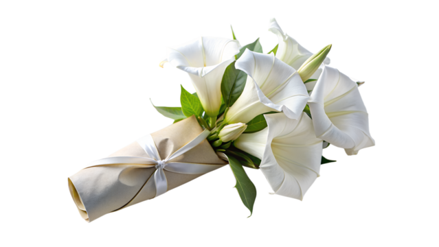 a beautiful bouquet of moonflower, elegantly wrapped in beige paper and adorned with a ribbon
