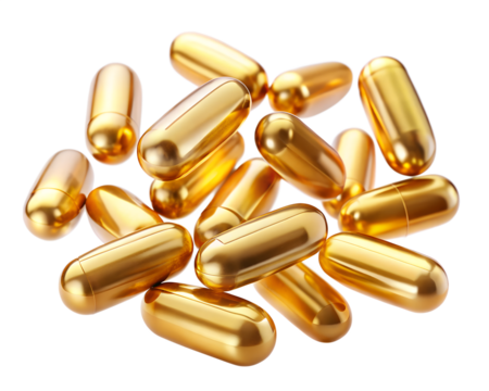 cod liver oil capsules  flowting on air isolated on white background. PNG Transparent file type with high definition quality And vibrant color grading Available.