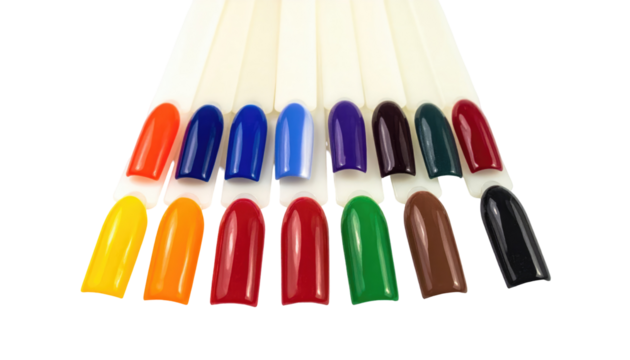 Array of varied polished nail color samples arranged on white fan handles against black backdrop with studio lighting