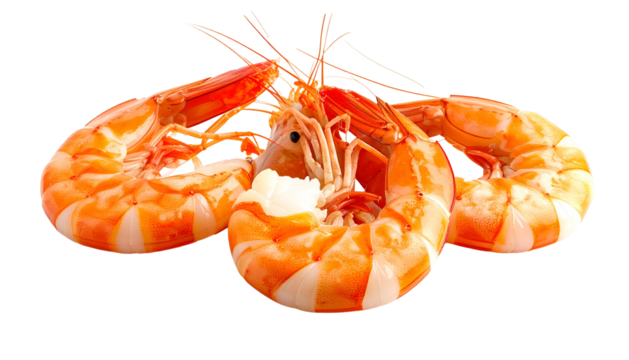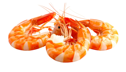 Close-up of three cooked shrimp, showing detail and orange-white coloration against black