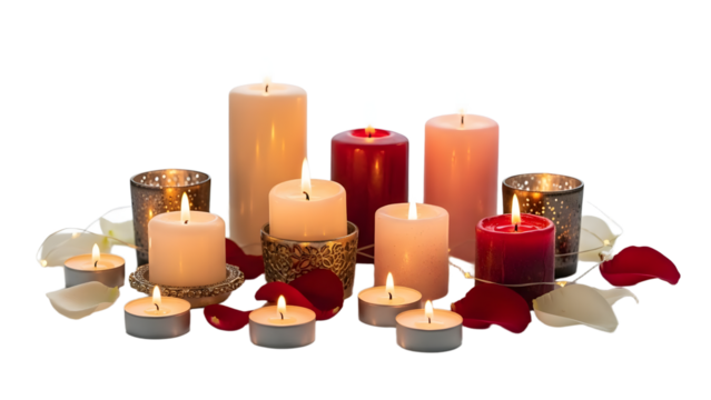 A collection of lit candles and rose petals on transparent background