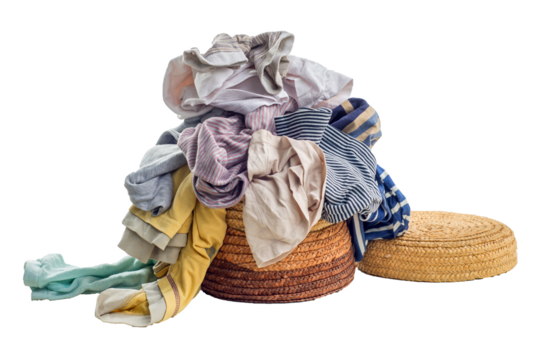 Used clothes in a pile on a laundry basket. Sorting and cleaning second-hand. Preparing for washing