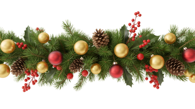 Vibrant Christmas garland with red and gold ornaments on pine branches