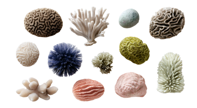 Isolated array showcasing a vibrant assortment of various ocean coral formations