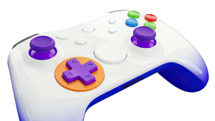 White gaming controller with purple and orange accents