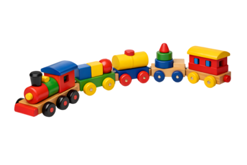 A colorful toy train with steam cars representing childhood fun, playtime creativity, and vintage locomotive design isolated on white background