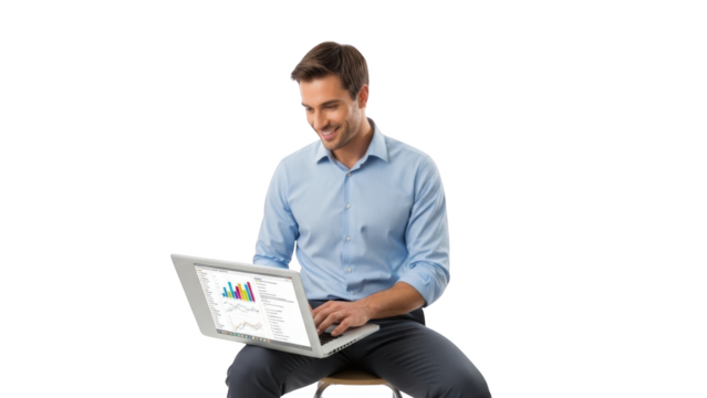 A man sits on a stool, working on a laptop displaying colorful graphs and charts in a relaxed, casual environment.