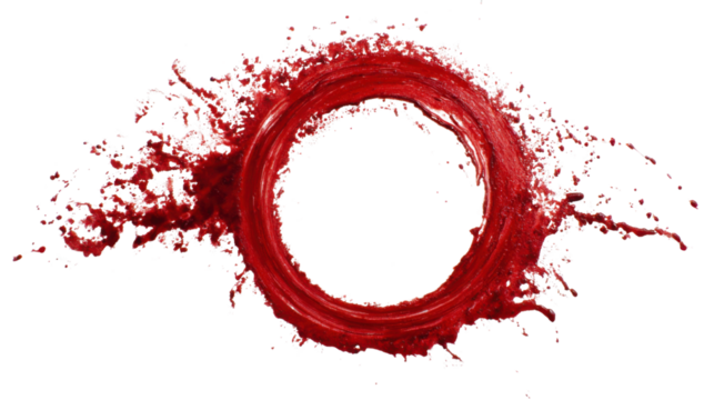 Red ink splash forming a dynamic circular frame with paint dripping and splattering, transparent background