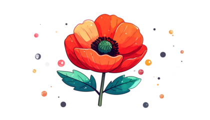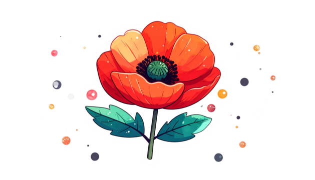 A vibrant orange poppy with green leaves and stem, surrounded by colorful dots on black