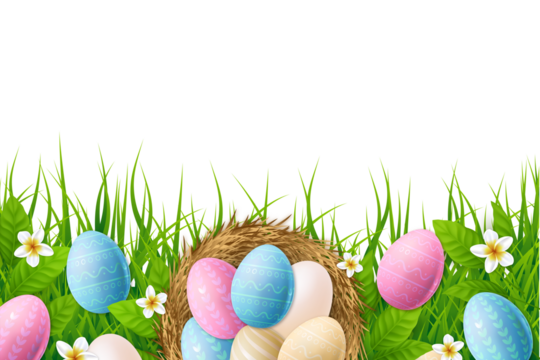 Colorful pastel easter eggs nestled in green grass with delicate white flowers celebrating spring isolated on transparent background
